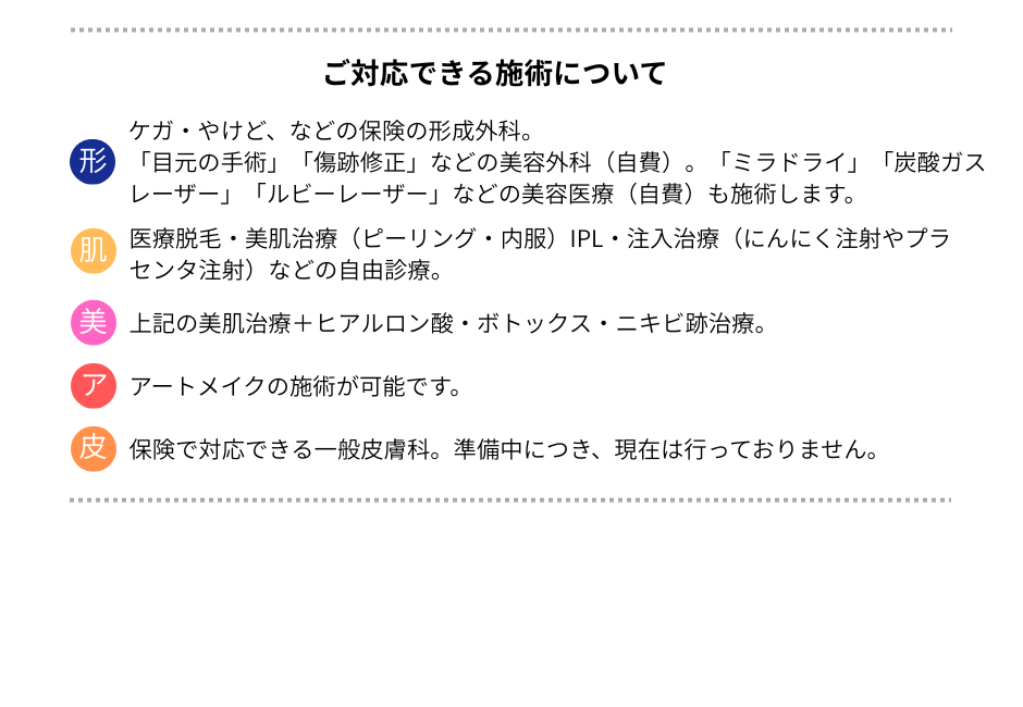 形成外科、美容外科、美容皮膚科の保険治療と自費治療を両方兼ね備えたクリニックです。